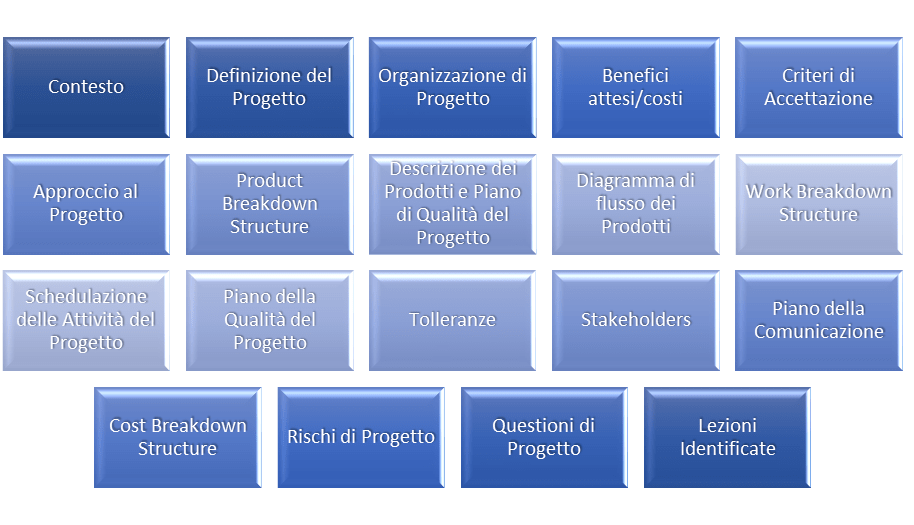 - Informazioni generali: contesto, definizione del progetto, obiettivi, ambito, presupposti e vincoli, budget, organizzazione di progetto