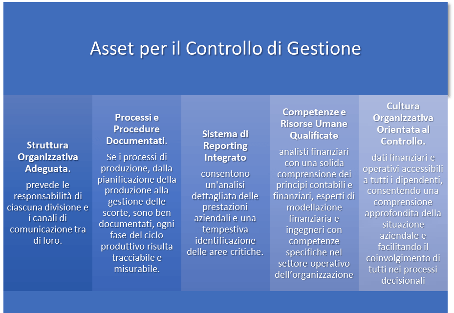 Tuttavia, in base a tali principi e alle migliori pratiche di gestione, è possibile identificare alcuni asset organizzativi che possono essere considerati importanti per il controllo di gestione. Vediamo quali sono: