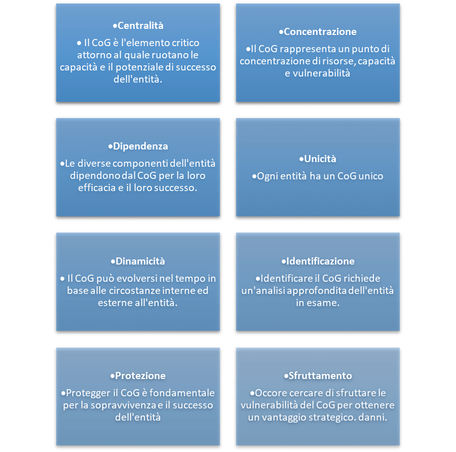 È importante sottolineare che questi sono solo alcuni degli elementi che possono comporre il CoG. L’identificazione e la valutazione degli elementi del CoG dipendono da una analisi specifica del contesto e dell’entità a cui si applica il concetto.
