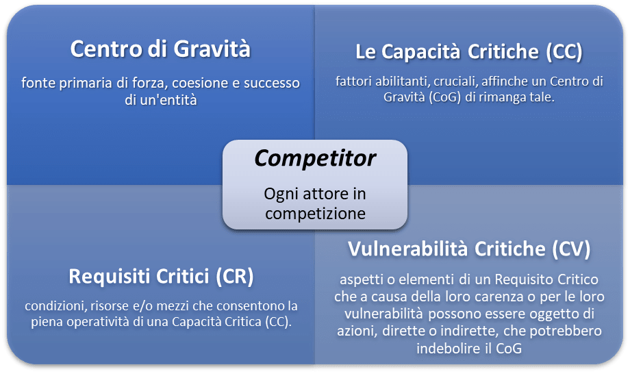 - Capacità Critiche (CC): cioè i fattori abilitanti, cruciali, affinche un Centro di Gravità (CoG) di rimanga tale. Dobbiamo identificare quindi anche le nostre Capacità Critiche, in quanto sono essenziali per il raggiungimento dei nostri obiettivi.