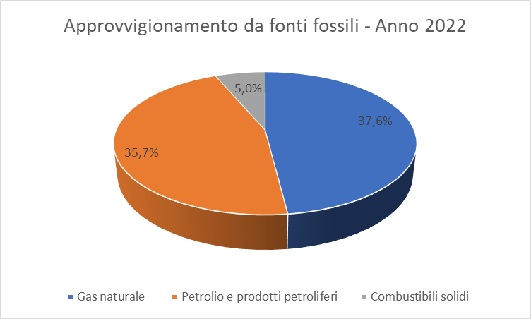 - Gas naturale: 37,6% del fabbisogno energetico nazionale nel 2022. L’Italia importa la maggior parte del gas naturale che consuma, principalmente da Russia, Algeria e Azerbaigian.