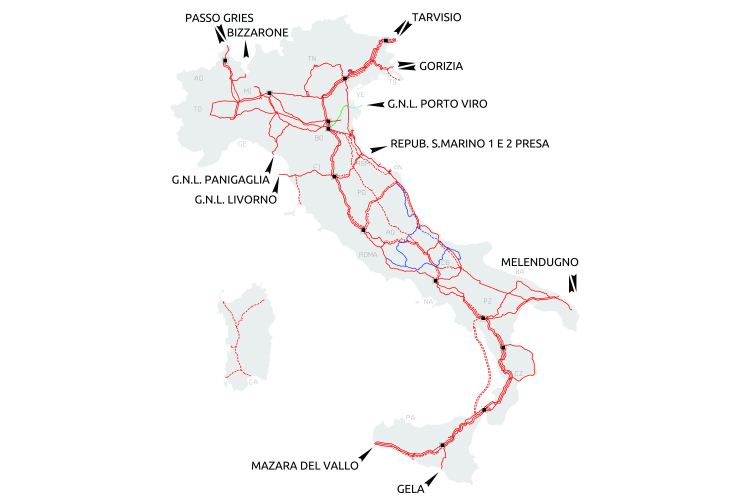- La rete di trasporto nazionale collega i principali centri di produzione e importazione del gas con i punti di ingresso nella rete nazionale, consentendo il trasporto su lunghe distanze.