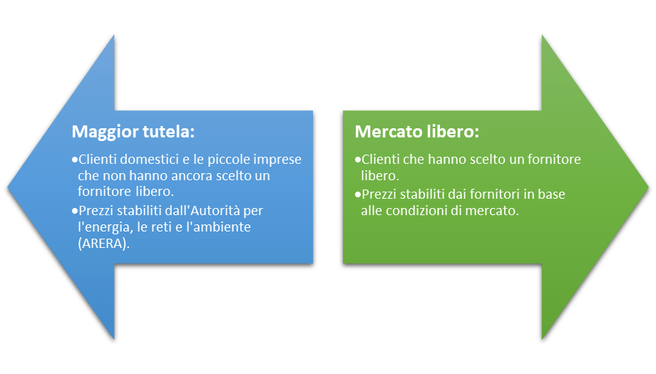- Maggior tutela: per i clienti domestici e le piccole imprese che non hanno ancora scelto un fornitore libero. I prezzi sono stabiliti dall’Autorità per l’energia, le reti e l’ambiente (ARERA).