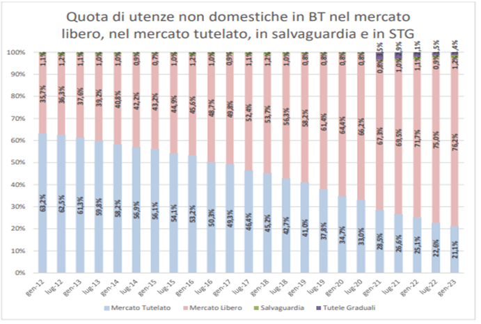 L’evoluzione del mercato libero dell’energia elettrica e le norme per il superamento del regime dei prezzi, regolati a partire dalla legge 4 agosto 2017 n. 124 (Legge annuale per il mercato e la concorrenza), ha previsto la cessazione del regime dei prezzi regolati per gli utenti finali e le imprese connesse in bassa tensione con meno di 50 dipendenti e un fatturato annuo non superiore ai 10 milioni di euro che non scelgano un fornitore sul mercato libero.