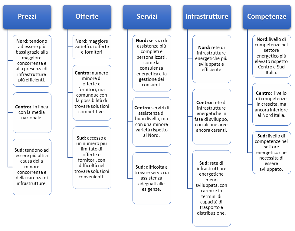 - Sud: Le imprese del Sud hanno accesso a un numero ancora più limitato di offerte e fornitori, con difficoltà nel trovare soluzioni convenienti.