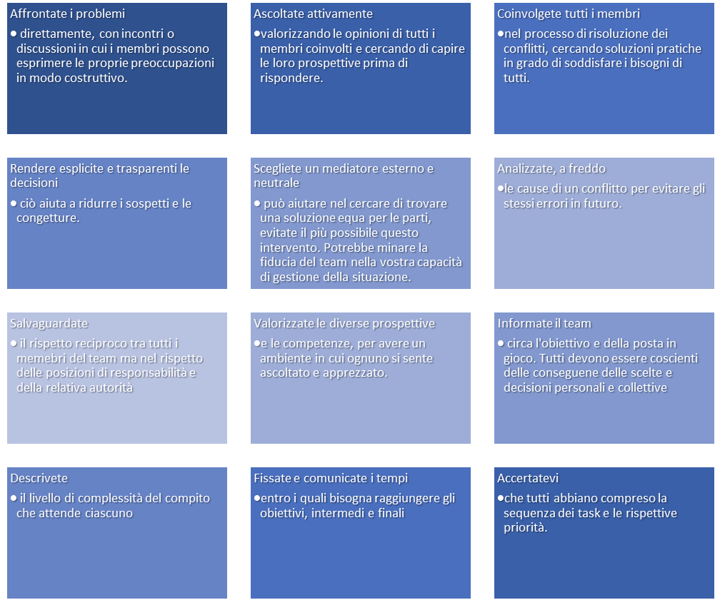 Sempre nell’ambito della mia personale esperienza, di seguito alcuni consigli su come prevenire ed eventualmente gestire la conflittualità nel team.